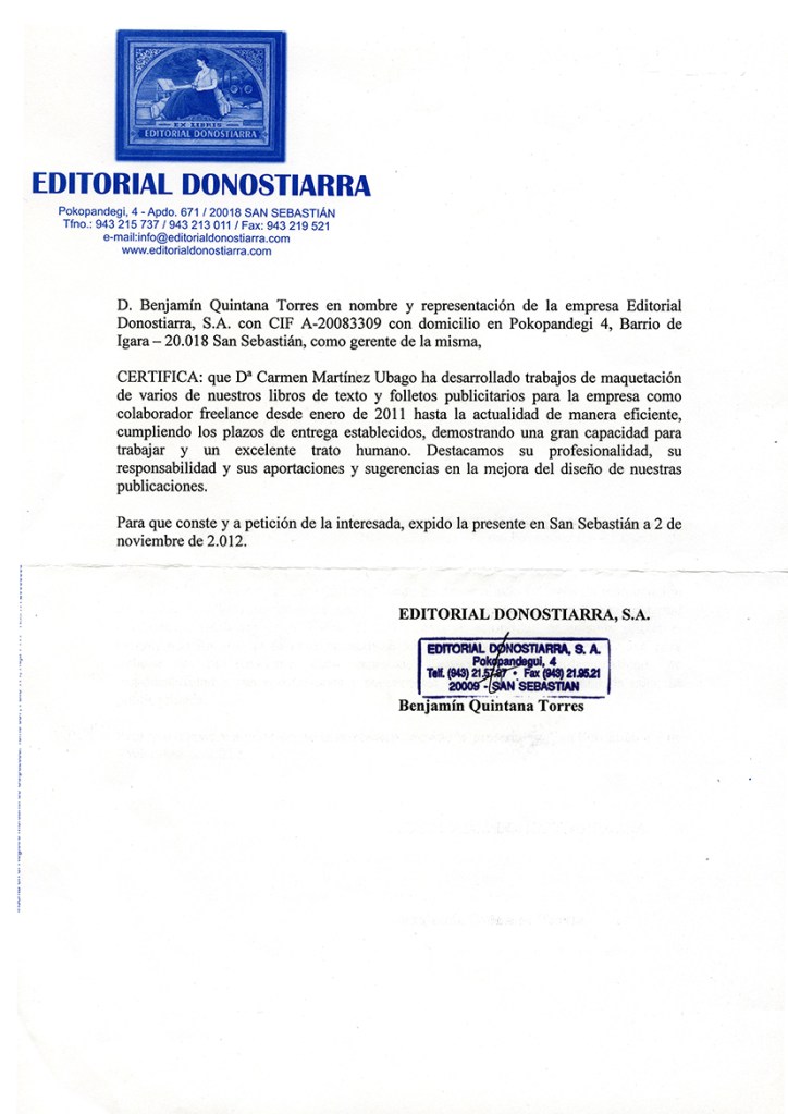 Soy Carmen Martínez de Ubago, diseñadora gráfica, ilustradora y retratista donostiarra. Tengo una experiencia contrastada de 32 años en estos campos. Trabajé en diversas agencias de publicidad durante 11 años y desde hace 21 años soy Freelance, trabajo desde casa como autónoma en Urdanibia (Irún), donde resido desde el 2010. Realizo trabajos de diseño gráfico para clientes como KNORR BREMSE IBERICA y maqueto libros de enseñanza para clientes como la EDITORIAL DONOSTIARRA y he maquetado guías-callejeros y actualizado planos para ZURELEKU. Además dibujo RETRATOS A CARBONCILLO y pinto acuarelas. Ilustro portadas de libros y carátulas – portadas de DVD de música. Me encantaría ilustrar libros infantiles. Dispongo de coche.