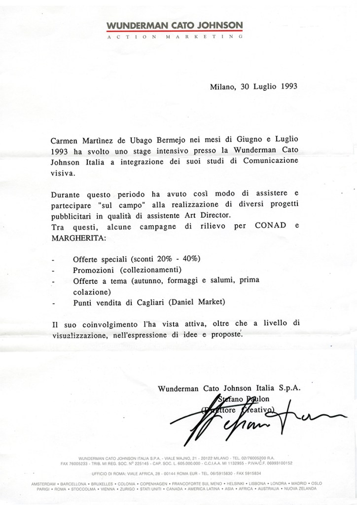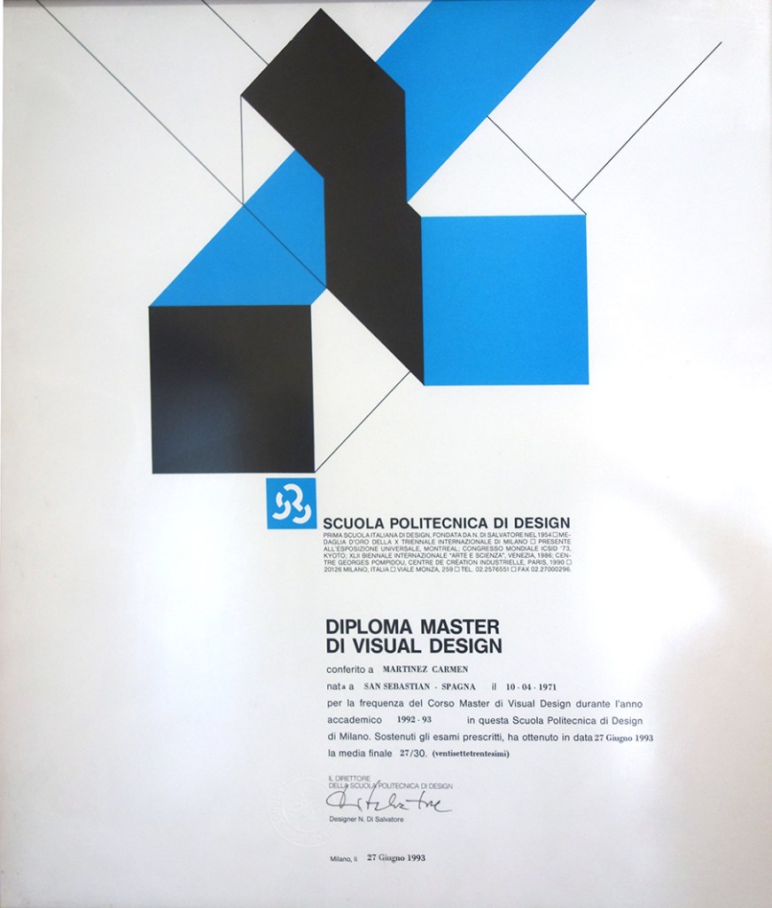 - 1992 – 1993:MASTER IN VISUAL DESIGN (DISEÑO GRÁFICO). EN LA SCUOLA POLITECNICA DI DESIGN. MILAN, ITALIA. Media final: sobresaliente.