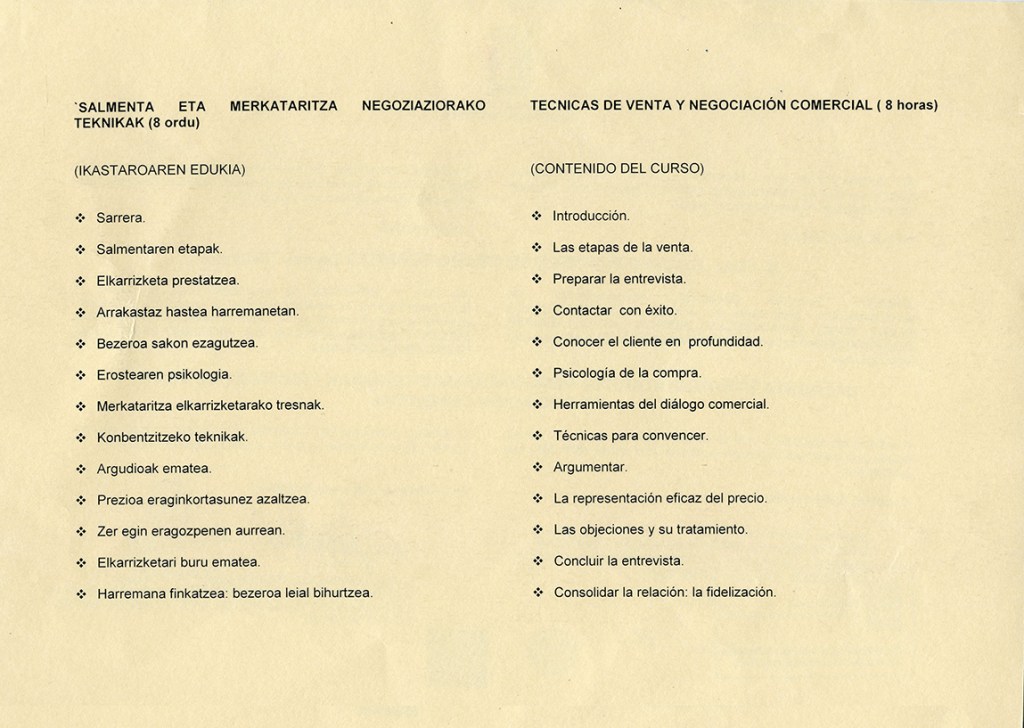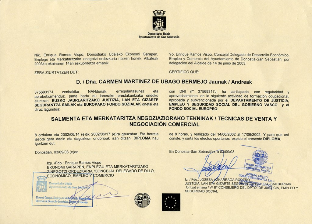 –Diploma de Curso de 8h: Técnicas de venta y negociación comercial. 14 al 17/06/2002. Subvencionado por el Departamento de Justicia, empleo y Seguridad Social del Gobierno Vasco y el Fondo Social Europeo.