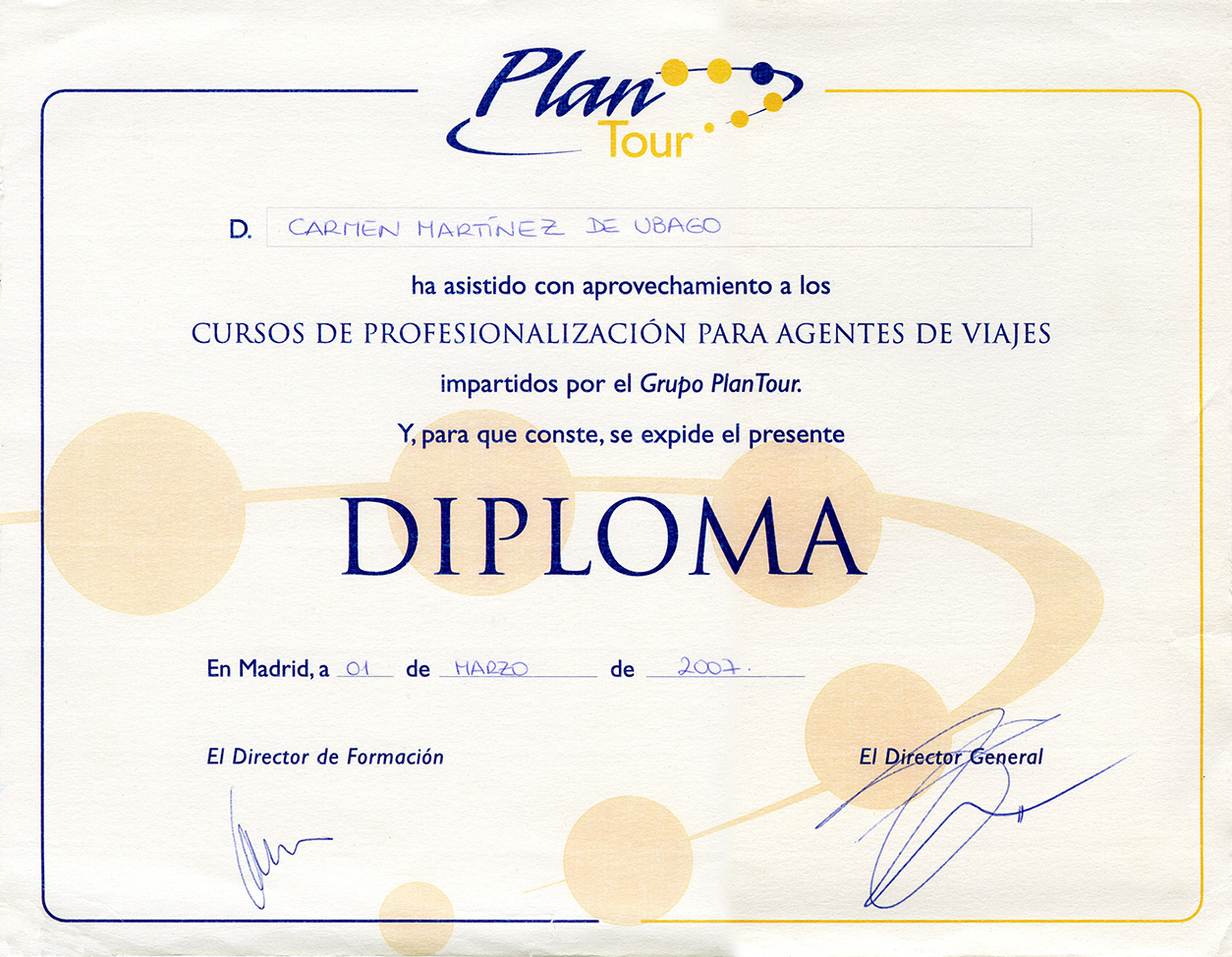 –Diploma por realizar un Curso de 3 semanas (mañanas y tardes, 8,5h/día) de Profesionalización para AGENTES DE VIAJES en Valencia en marzo del 2007, impartido por el Grupo PlanTour.