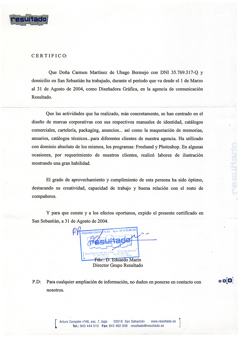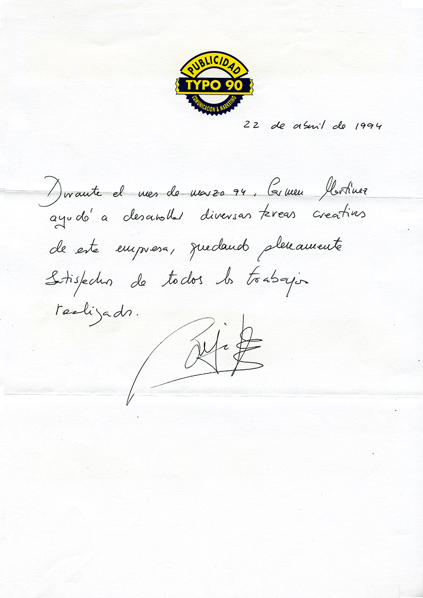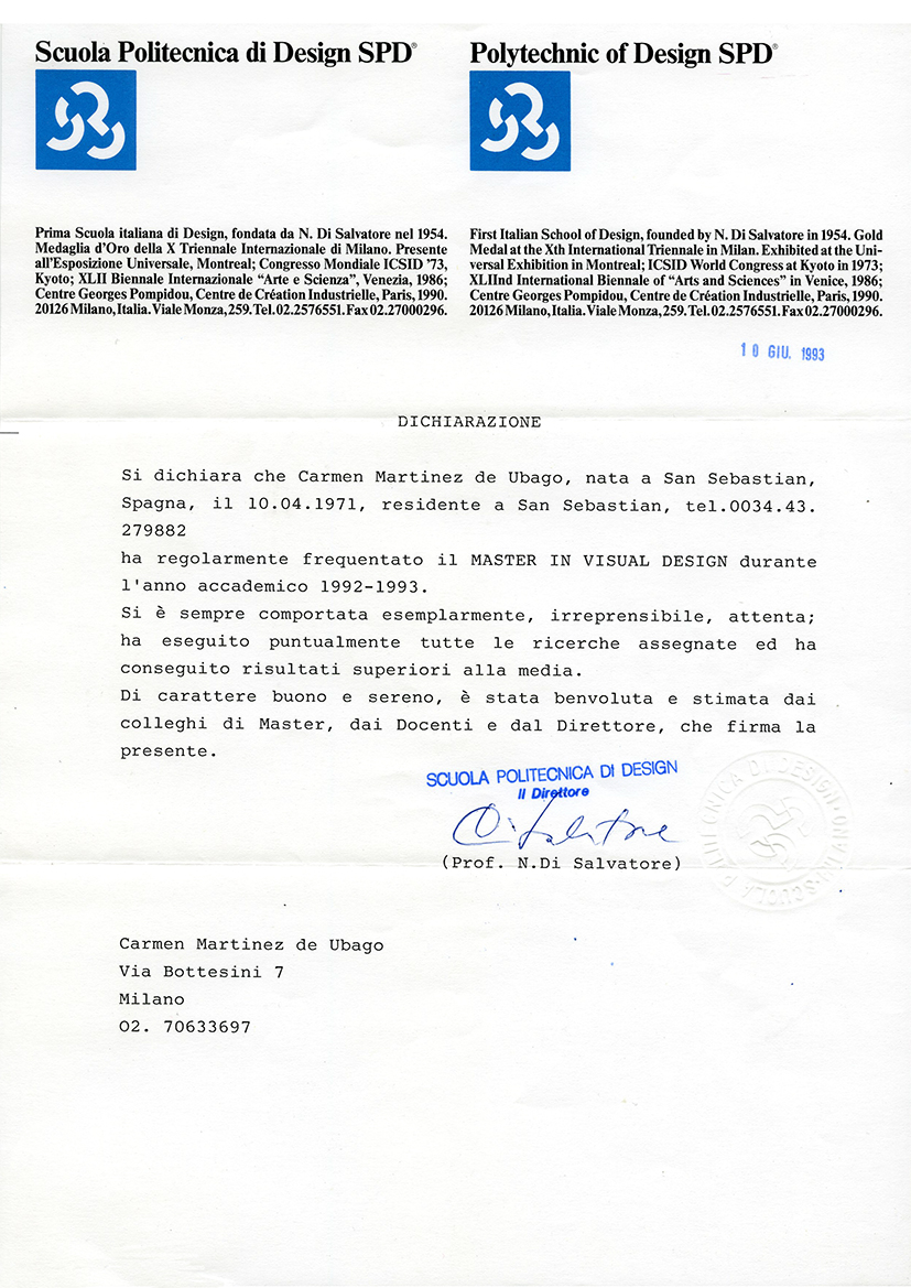 - 1992 – 1993:MASTER IN VISUAL DESIGN (DISEÑO GRÁFICO). EN LA SCUOLA POLITECNICA DI DESIGN. MILAN, ITALIA. Media final: sobresaliente.