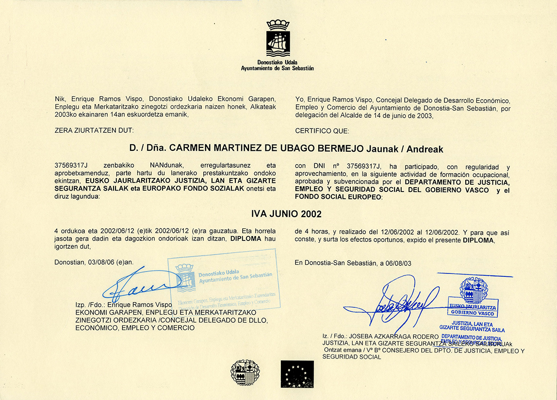 –Diploma de Curso de 8h: Técnicas de venta y negociación comercial. 14 al 17/06/2002. Subvencionado por el Departamento de Justicia, empleo y Seguridad Social del Gobierno Vasco y el Fondo Social Europeo.