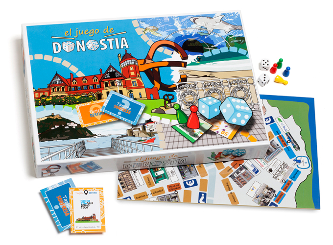 llustraciones (de las tiendas y de lugares emblemáticos de Donostia-San Sebastián), diseño gráfico (del tablero, la caja, los billetes, las tarjetas sorpresa y de la hoja de instruciones) y Packaging del Juego DONOSTIA JOKOA / EL JUEGO DE DONOSTIA. Diseñado en el año 2018 como Freelance para Enric Cervera.