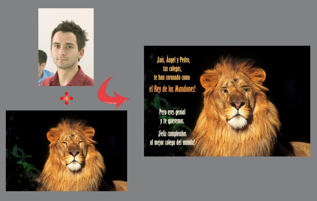Colocación de la cabeza, ojos, etc de un familiar o amigo o de ti mismo/a en una fotografía graciosa de un oficio, o de carnaval, o en un animal, o lo que se te ocurra. Puedo añadir tu mensaje o dedicatoria.